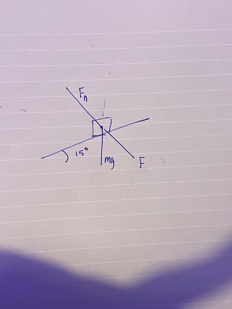 Denna bild är inte korrekt. För det första skall Fn vara vinkelrät mot planet. Den kraft du skrivet som F är möjligen en komposant till mg så den kommer du till sedan. Du har inte ritat ut friktionskraften.