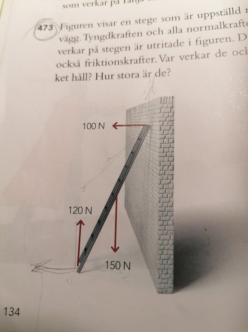 Kloky skrev:473. Figuren visar en stege som är uppställd mot en vägg. Tyngdkraften ochh alla normal krafter som verkar på stegen är utritade i figuren. Det finns också friktionskrafter. Var verkar de och åt vilket håll? Hur stora är de?