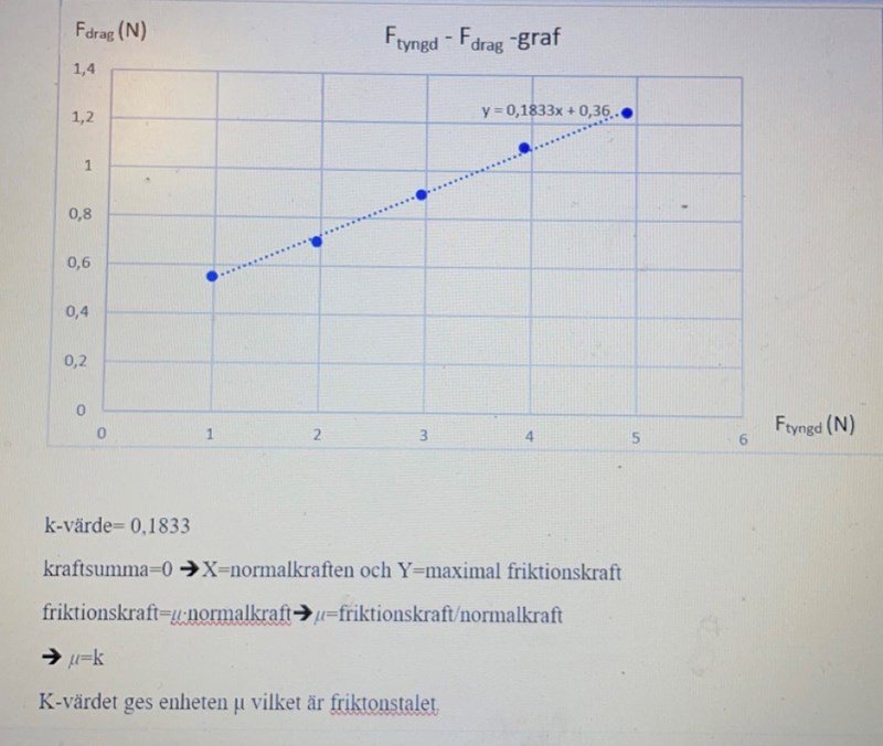Hej! En Kloss belastad med olika vikter dras i konstant hastighet mot ett plant underlag. Lite olika värden är utsattai tabellen o grafen, utifrån olika tyngder som använts. Varav jag ska tolka K och M värdet och ge det en enhet. Har lyckats med nånting på K men förstår inte vad M värdet borde innebära.