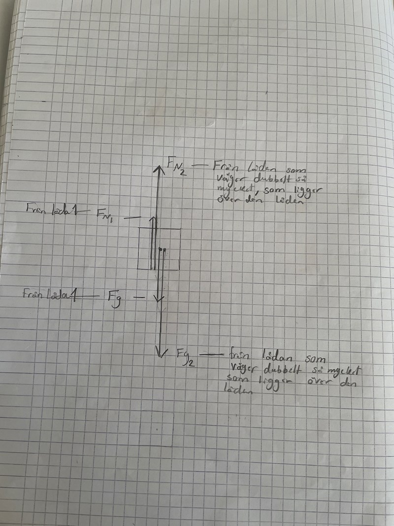 Jag har inte uppgiften för det var en fråga på provet som jag gjorde, men det är så jag tönkte att dom långa krafter är från lådan som ligger över som väger dubbel så mycket som den lådan vi frilägger