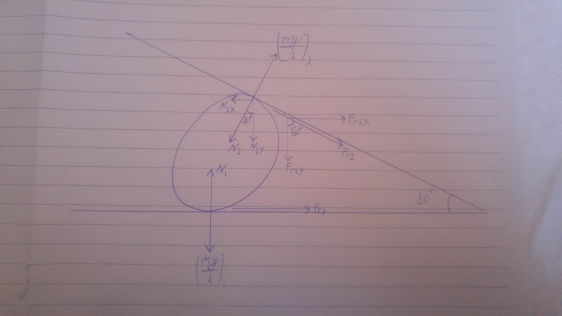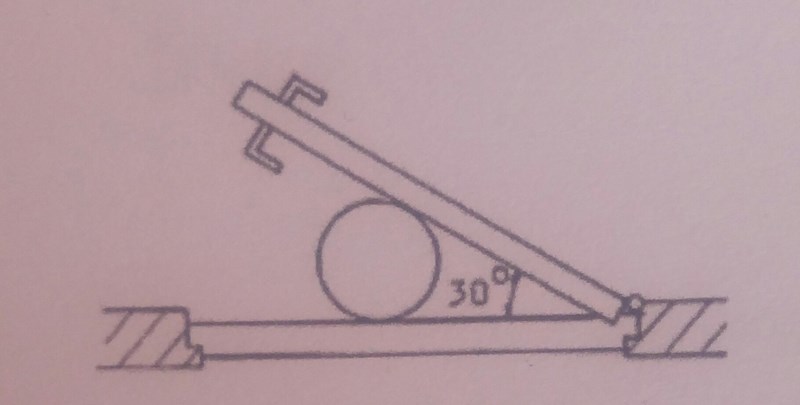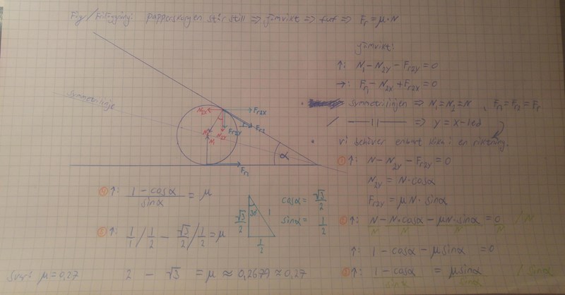 Dörrarna i skolan är försedda med dörrstängare, dvs en anordning som strävar att stänga dörrarna. Om en rund papperskorg ställs mellan tröskel och dörr, glider den först ett stycke men stannar sedan med dörren på glänt. Vinkeln mellan tröskel och dörr uppmättes vid ett tillfälle till 30°. Hur stort är då friktionstalet mellan dörr-papperskorg-tröskel? Friktionen mot golvet försummas.