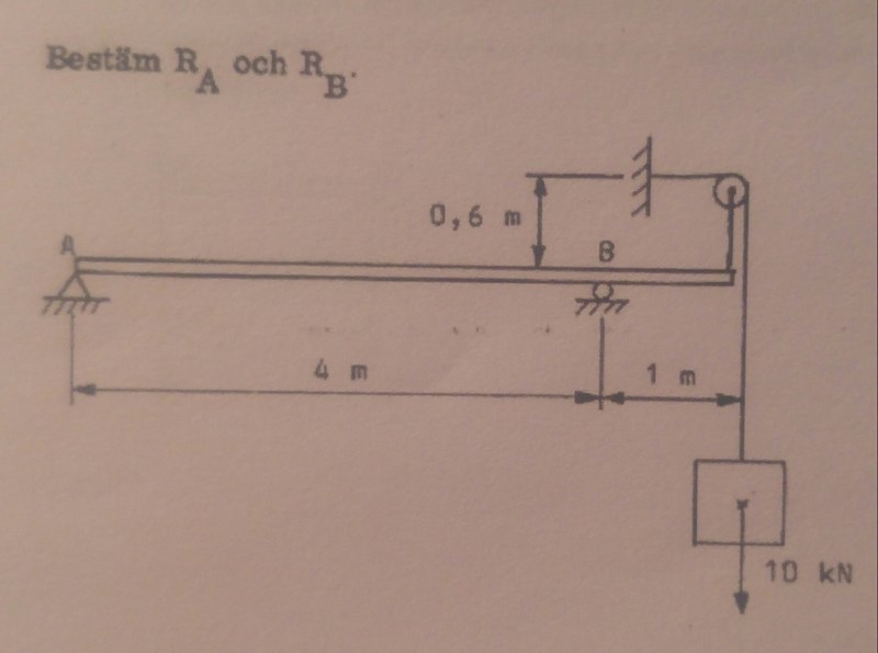 Om man bortser från trissan så är det ju en kraft (10kN) riktad åt vänster på "stolpen som sitter fast i balken" ....