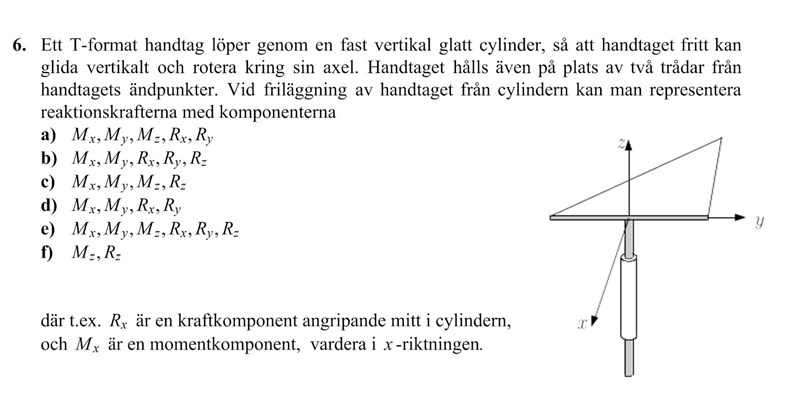 D4NIEL skrev:Jag tolkar uppgiften som att man bara ska frilägga från cylindern och att det är reaktionskrafter och reaktionsmoment från cylindern man är intresserad av.