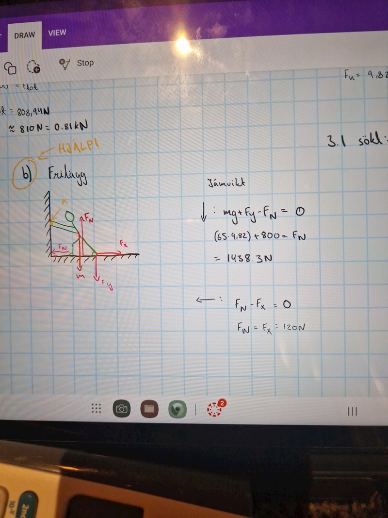 1, i y riktning vet vi att Lotta pressar nedåt med 800 N, skillnaden mellan 800 och hennes tyngdkraft, mg, kommer från händernas kontakt med väggen.