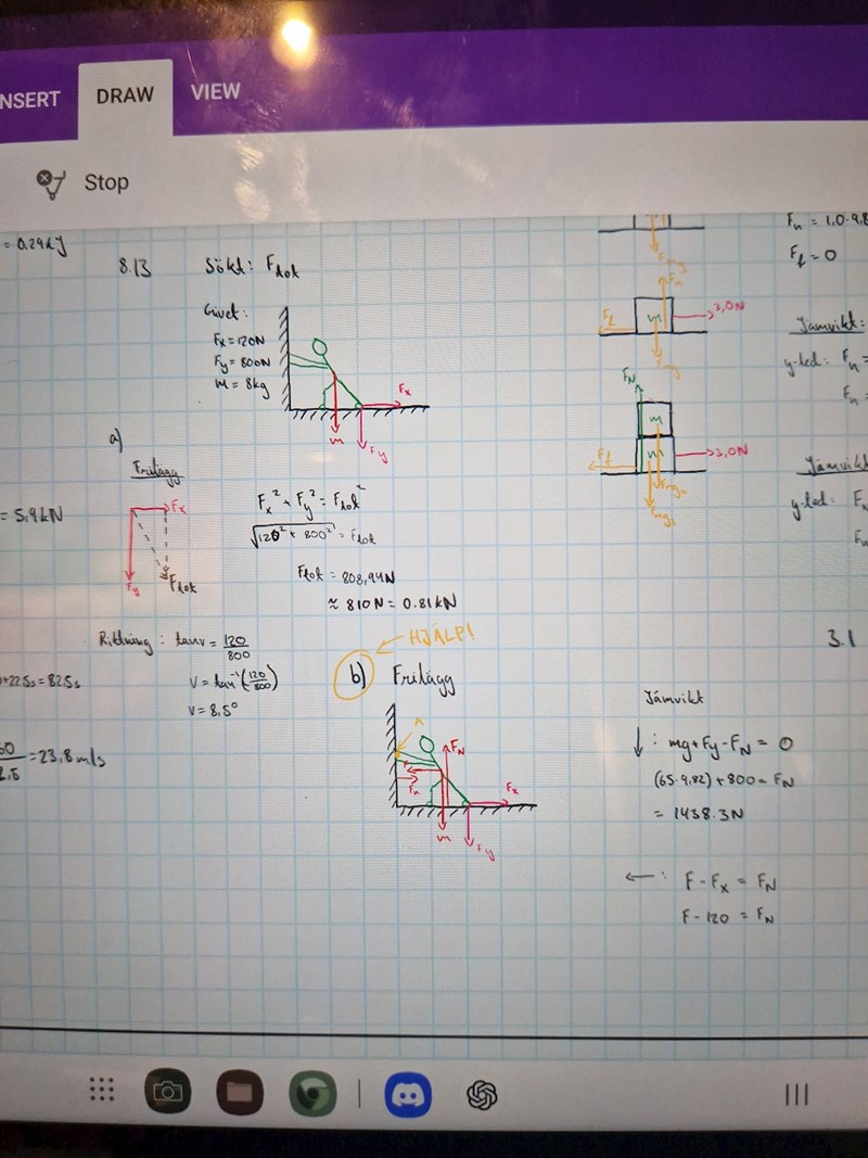 Krafterna I x-led är då 120N och y-led är de 1438.3N är det korrekt än så länge? Kraften från väggen borde då var 120N men enligt facit är det 0,20kN I en riktning som bildar 37° , varför? HUR?