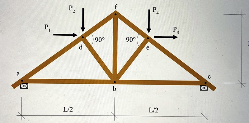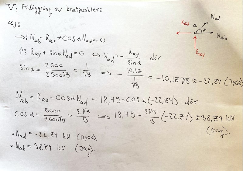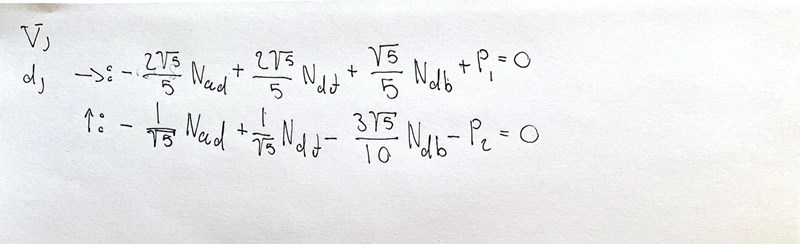 Mitt problem gäller knutpunkt d, det finns två okända och eftersom jag känner till Nad, jag borde därför hypotetiskt kunna lösa ut normalkrafterna men problemet är att ingen av Ndf och Ndb är strikt horisontell eller vertikal, dessa är därför båda i ekvationerna (längst ner). Det måste vara något som jag missar men ser inte vad det är. Tack!