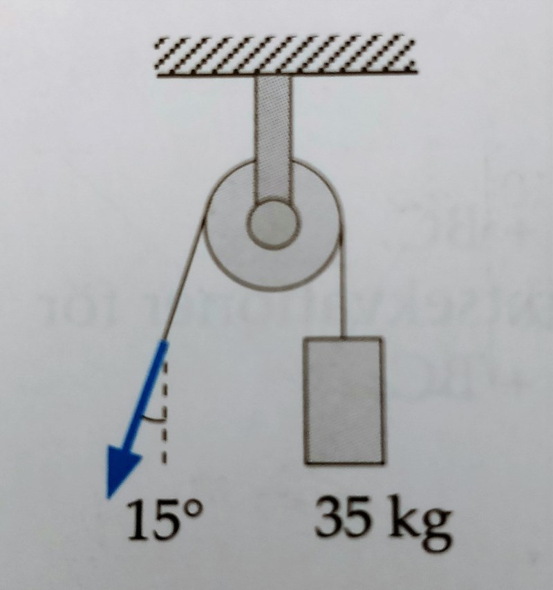 Har suttit en bra stund och kommer inte på hur man ska lösa uppgiften. Förstår att man måste frilägga trissan och när jag gör det så tänker jag att tyngdkraften för vikten, linkraften åt vänster samt en normalkraft uppåt verkar på trissan. Linkraften S tänker jag måste motsvaras av tyngden på vikten? Så att .