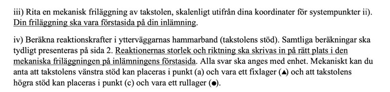 Utifrån uppgiftsbeskrivningen har jag börjat på detta vis, min första fråga är gällande om det spelar roll om jag anger stödkrafterna vid punkt (a) eller (c). Jag försöker lösa (iii), alltså att frilägga systemet men i (iv) nämns det att (a) är ett fixlager medans (c) är ett rullager dvs. saknar horisontell kraft komponent. Är informationen iv) väsentlig för att lösa iii), utifrån min förståelse verkar det vara väsentligt men tycker att det är konstigt att informationen inte ges i iii).