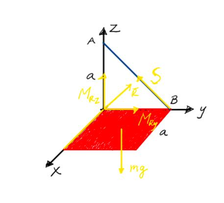 Du kan exempelvis räkna momentjämvikt kring en axel parallell med z-axeln som skär punkten (a,0,0). Detta ger: