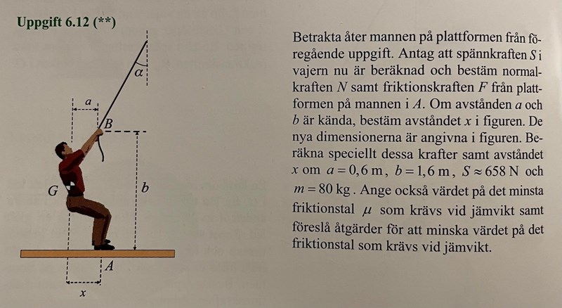 Rita en figur med friläggning av mannen och försök ställa upp jämviktsekvationer för krafter i vertikalt led, horisontellt led och kraftmomentet kring A.