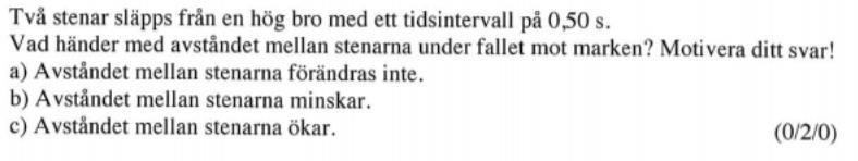 "Ett tidsintervall på 0,50 s" menas helt riktigt med att en sten först släpps, och den andra efter en halv sekund efter.