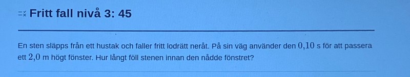 t=0.1s är givet i uppgiften och tyngdaccelerationen kan du säkert. När du vet V0 vid fönstret dvs. Hastigheten stenen har när den når toppen av fönstret så kan du beräkna hur länge stenen har måste ha fallit(accelererat) för att nå den hastigheten.