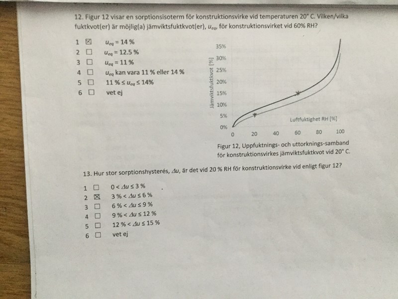 hej.Fråga Figur 12 visar en sorptionsisoterm för konstruktionvirke vid temperatur 20 C.vilken/vilka fuktkvot(er) möjlig(a) jämviktsfuktkvot(er) för konstruktionsvirket vid 60% RH?