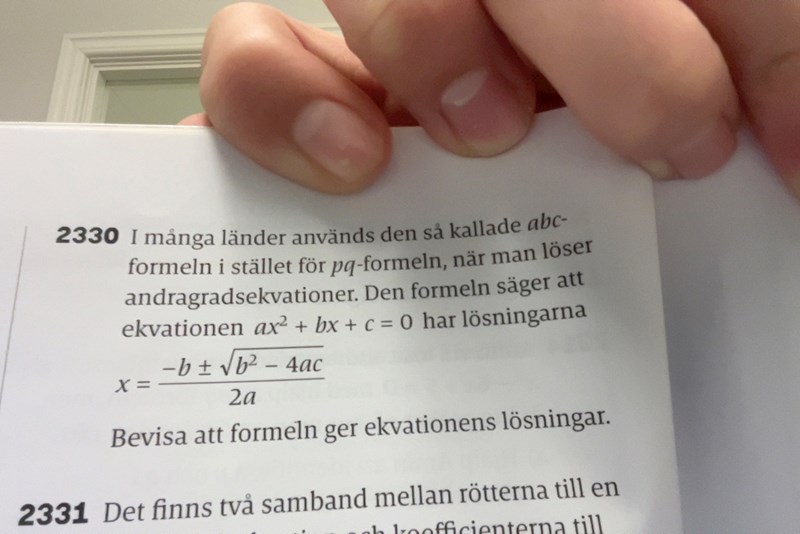 2330) Visa att abc formeln ger ekvationens lösningar. ax^2 + bc + c = 0 blir till x = (-6 +- roten ur(b^2 - 4ac))/2a