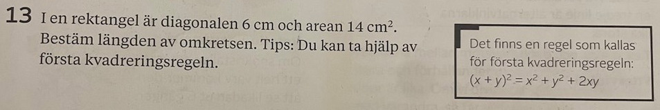 Du vet diagonalen och arean och kan därför ställa upp två ekvationer.
