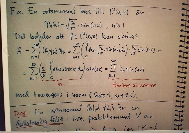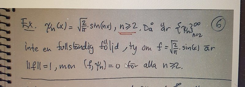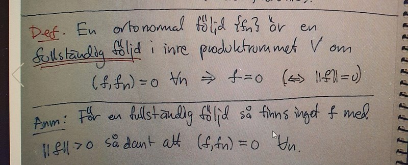 Vilket betyder det är fullständig om inre produkten (f, yn)=0 för alla n och normen av f dvs llfll =0 . Vektorrumet är L^2 (0, pi)