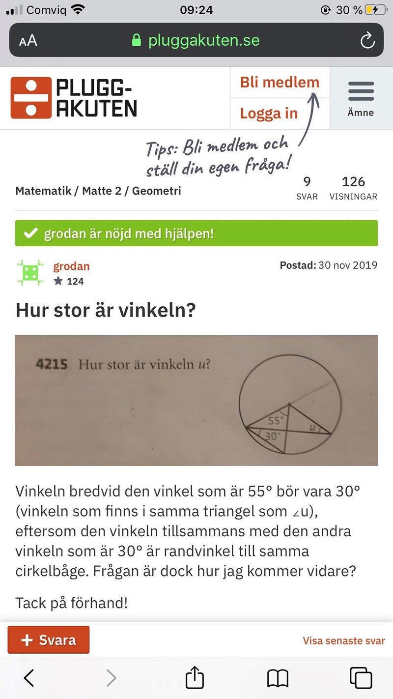 Hej! Jag har en fundering kring den frågan. Varför är det fel om man utgår från att vinkel som är motsatt till vinkel u är 180-90-55=35.? Dvs att man använder sig av den triangeln som har vinkel 55 grader, och utnyttjar att det är en rätvinklig med 90 grader. Sista vinkel borde ju vara 180-55-90? Men det är ju fel?
