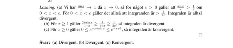 Okej jag tror ej jag förstår längre tyvärr. Vill du förtydliga steg för steg? Hur kan sin bara vara större än 1> eller mindre eller lika med -1? Att sinx ligger mellan dessa två värden förstår jag för den är begränsad mellan dessa två. Men sen har jag tappat bort dig och jag har svårt att se hur jämförelsesatsen ej kan tillämpas här. Jag trodde hela jämförelsesatsen var att jämföra med en enklare funktion som man vet antingen divergerar eller konvergerar i förhållande till uppgiftens givna integrand