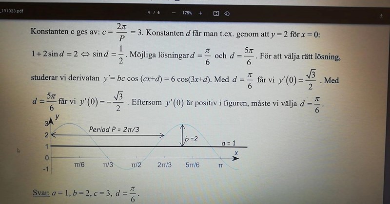 Hur skulle man ha nytta av konstanten c för att bestämma värdet på konstanten d? Man väljer punkten (0,2) eftersom den är lätt att läsa av. Punkten ligger mittemellan "mittlinjen" y = 1 och toppvärdet y = 3. Det betyder att sin(0+d) = ½. Hänger du med?