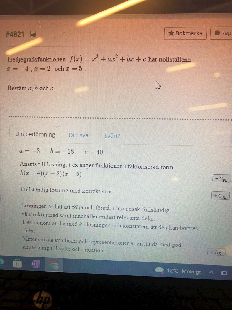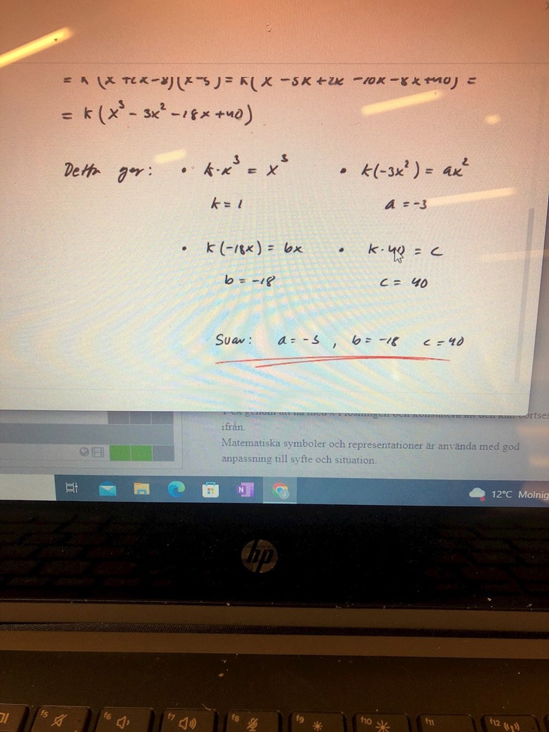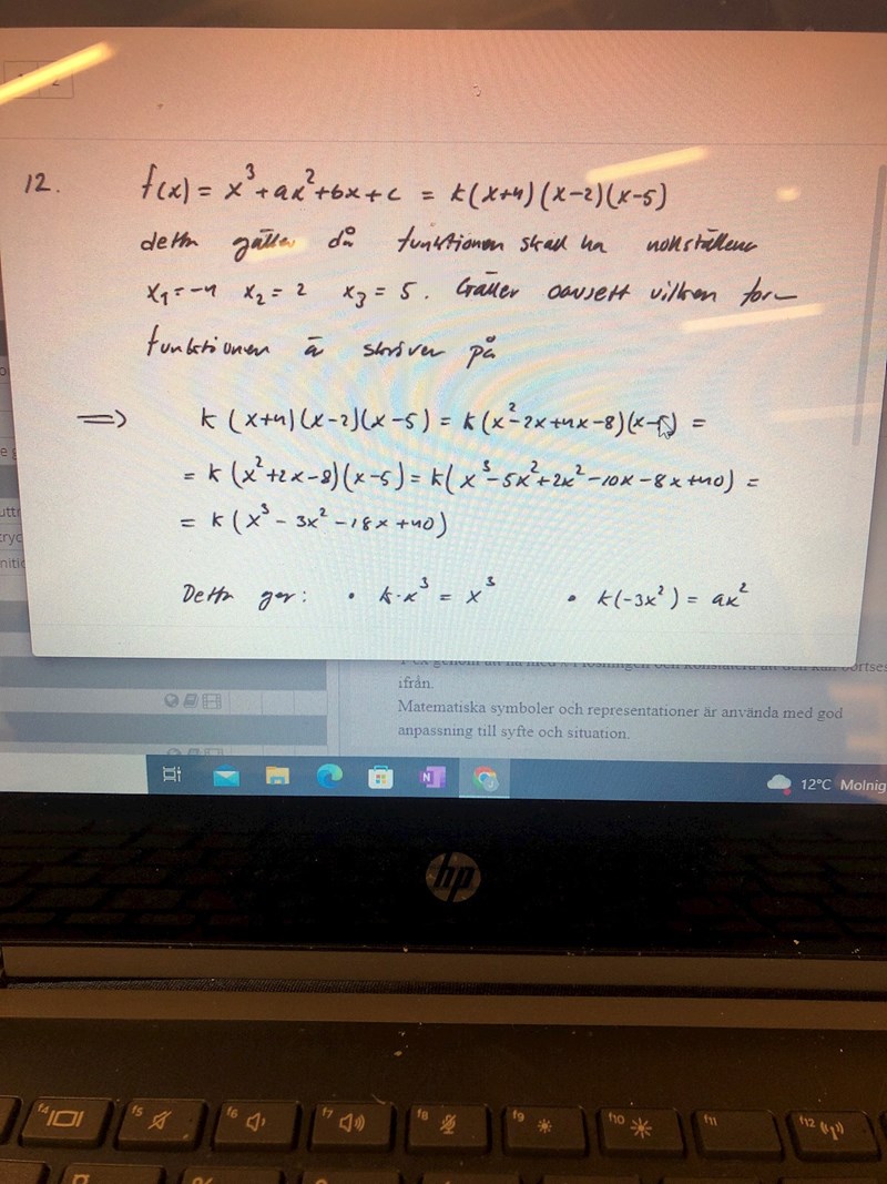Att du inte förstår beror på att det inte finns något att förstå. Dom inget har gjort mer än att skriva att k(x+4)(x-2)(x-5). Multiplicera ihop parenteserna, men k kan du hålla utanför. Samla sedan x3 -termen, x2 -termerna, x-termerna och bekant term för sig. Det finns bara en x3 -term och den har koefficienten 1. Därför blir k=1. Summan av koefficienterna för x2 -termerna måste sedan bli = a. Summan av koefficienterna för x-termerna måste vara =b och den bekanta termen ska vara c. Denna metod kallas för att IDENTIFIERA. Resultatet ska då vara ett uttryck som ska bli lika med f(x) för ALLA x. Det är det viktigaste.