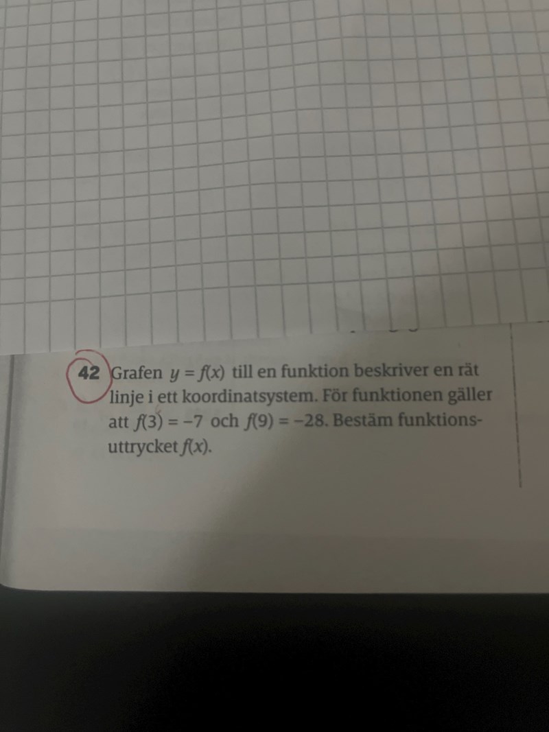Då det är en rät linje så har funktionen formen y=kx+m. k kan du beräkna genom . Då har man formen y=-3,5x+m. m värdet kan man få genom att sätta in en punkt, exempelvis f(3)=-7 och får då -7=-3,5*3+m, där m=3,5. Man får alltså y=-3,5x+3,5