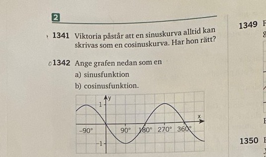 cosinuskurvan börjar vanligtvis ifrån 1 (0 grader) och sedan 0 (90 grader), sedan -1 (på 180 grader) och sedan 0 igen (270 grader). Sedan 1 igen (360 grader)