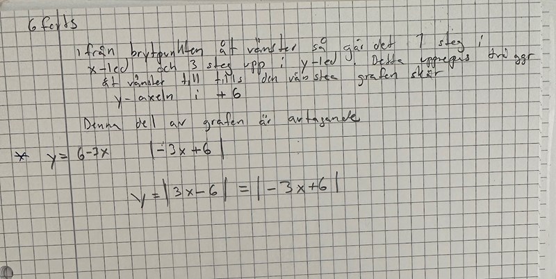 Till vänster om brytpunkten (dvs då x < 2) så har grafen ekvationen y = 6-3x, dvs y = -(-6+3x)