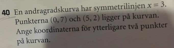 Som vanligt: man ritar! Rita in symmetrilinjen och de båda punkterna i ett koordinatsystem. Om du behöver mer hjälp: Lägg upp din bild här.
