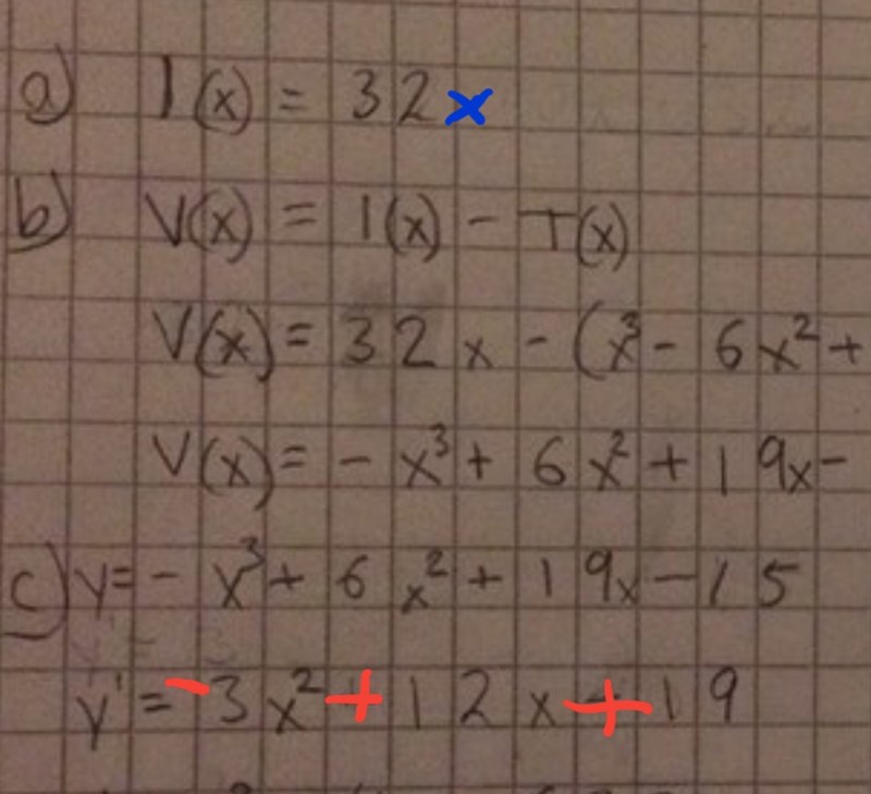 Du deriverade fel i uppgift C)                               -(x^3)+6(x^2)+19x ska bli -3(x^2)+12x+19