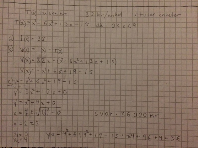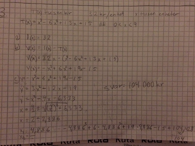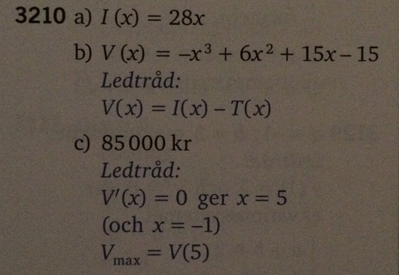 Sedan har du glömt att skriva att du sätter V'(x) = 0 för att hitta min/max/terrasspunkterna.