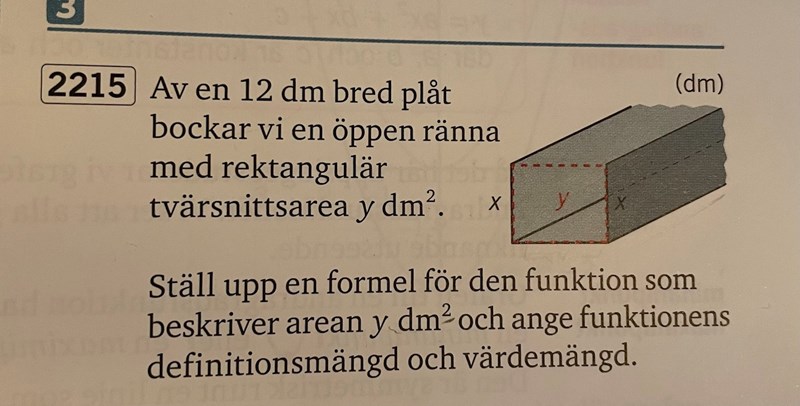 Man böjer upp x dm längs den ena långsidan, och x dm längs den andra långsidan. Båda de uppvikta sidorna är lika breda/höga. Det som är kvar är 12-2x dm.