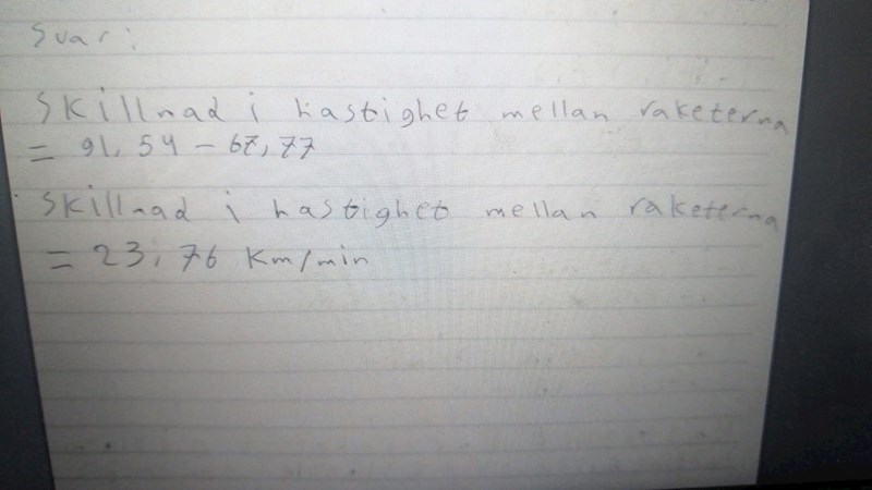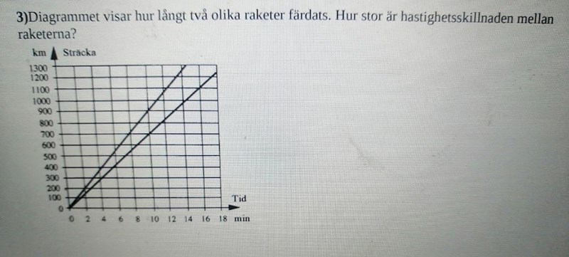 Smaragdalena skrev inte:Jag skulle välja att läsa av hur långt de båda raketerna har kommit efter 10 minuter, dela därför att värdena är lätta att läsa av, dels för att det är lättare att dela med 10 än med något annat värde (förutom 1 som är ännu enklare att dela med, men efter 1 minut är värdena svåra att avläsa).