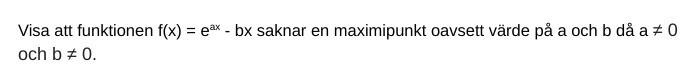 Första steget är i alla fall att derivera och sätta derivatan lika med 0.Om denna ekvation saknar rötter, vet man att funktionen antingen är växande eller avtagande i hela intervallet.