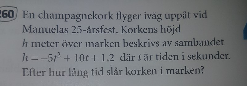 Tips: när korken slår i marken är h=0. Vid vilka tider inträffar det?