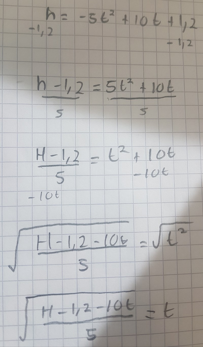 Ekvationen du skall lösa är h(t)=0, d v s -5t2+10t+1,2=0.