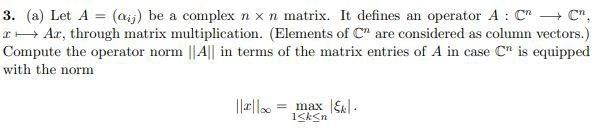 Vi kan ta xi=0,...,0,1,0,...,0x_{i} = \left(0,...,0,1,0,...,0\right) där vi har 1 på i:te komponenten. Eftersom xi=1\Vert x_{i} \Vert = 1 så jämför vi alla AxiAx_{i} och får du ut alla kolonnerna (en för varje xix_{i}) i matrisen AA. Sen vill vi då veta normen av kolonnerna, vilket är elementet med störst belopp i kolonnen. Jämför vi alla dessa borde i väl få att A=max(ai,j)\Vert A \Vert = max(a_{i,j}) ? Alltså är normen av operatorn det största elementet i matrisen sett till dess norm? Och matrisen/operatorns norm beror då på dess element?