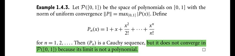 Du har en cauchyföljd, men den konvergerar inte. En följd kan inte konvergera utan att konvergera mot något, definitionen är väl att |fn-gräns|->0 eller liknande? Och det finns ingen gräns som är ett polynom som uppfyller det.
