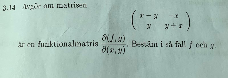 Tack! Hahaha, okej. Vad konstig frågeställning då, de borde ju frågat efter f och g först och kunde egentligen skippat jacobianen