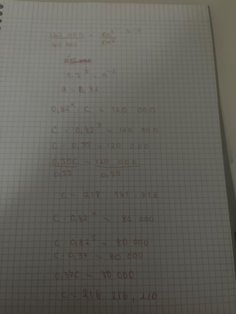 Anledningen till att dina båda värden skiljer sig lite är för att a=0,82 är avrundat. Det exakta värdet är vilket ger inköpsvärdet till nästan exakt 120000 (egentligen 220454,076...)