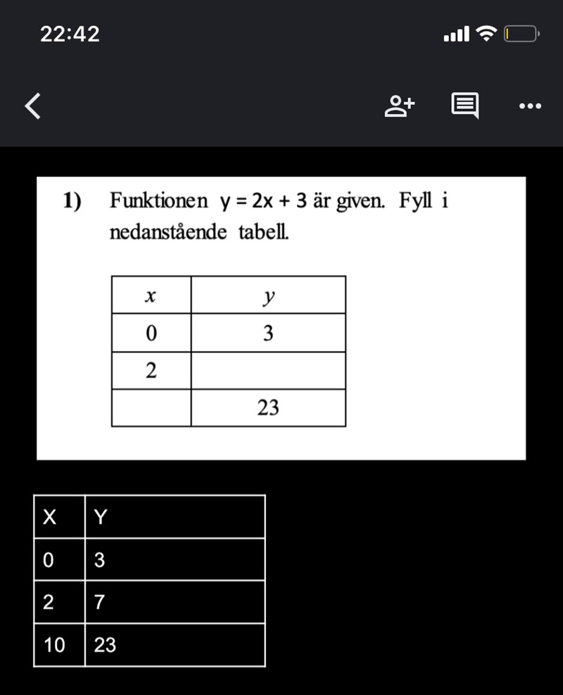 Smaragdalena skrev:a) Du vet att y = 2x+3 och att x = 2. Sätt in 2 där det står x i formeln och räkna ut y-värdet.