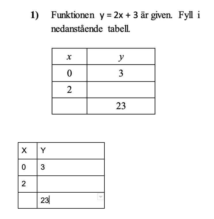 a) Du vet att y = 2x+3 och att x = 2. Sätt in 2 där det står x i formeln och räkna ut y-värdet.