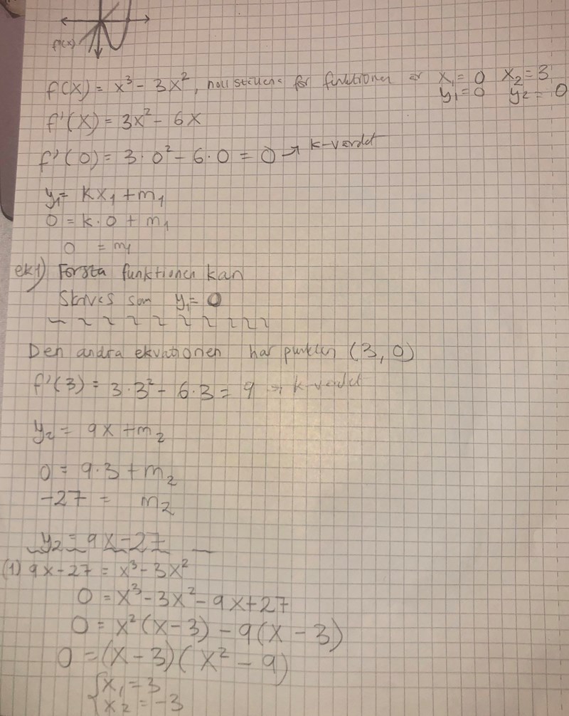 Använd nu den skissen och rita in de två tangenterna y = 0 och y = 9x - 27 ungefärligt.