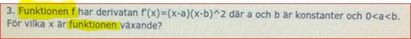 Då kommer det bli att (x-x)=0 då kommer (0) gånger oavsett vad bli 0. Då kommer f’(x)=0. Detsamma gäller om b=x . uttrycket kommer då att bli 0.