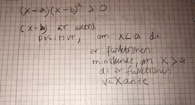 om a=x eller b=x då är funktionen lika med 0. Men om a< x då är funktionen minskande, (x-b) kommer aldrig att bli negativt för det är ”upphöjt med 2”.