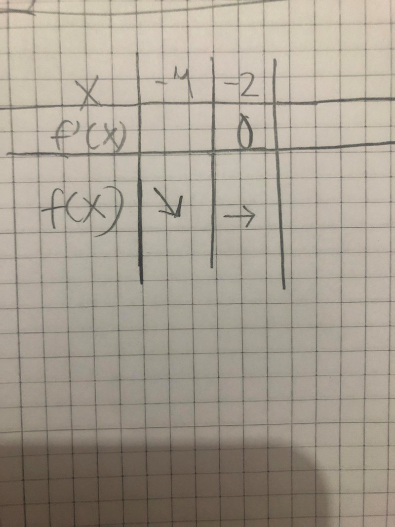 Vid x = -2 har derivatagrafen en negativ lutning, alktså är f''(-2) < 0, vilket betyder att f(-2) är en maxpunkt.