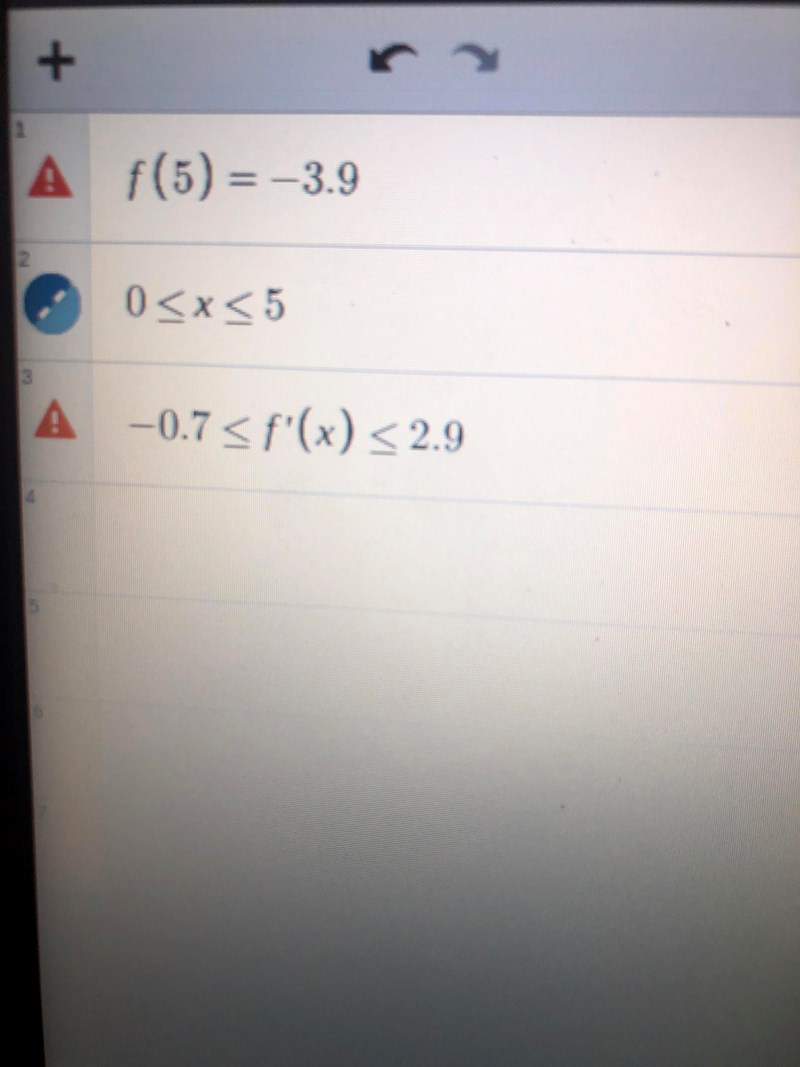 Fall 3. Om man antar att derivatan f'(x)f^\prime(x) är konstant för alla 0x50\leq x\leq 5 (vilket inte behöver vara fallet, men det möjliggör att problemet kan lösas) så kommer funktionsvärdet f(0)f(0) att ligga mellan -18.4-18.4 och -0.4-0.4.
