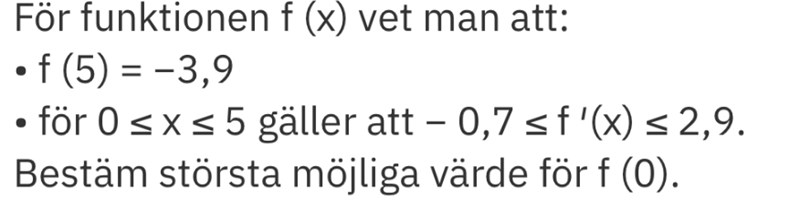 Fall 1. Om f'(x)=-0.7f^\prime(x) = -0.7 för alla 0x50\leq x \leq 5 så är funktionen f(x)f(x) en rät linje med lutning -0.7-0.7 som går genom punkten (5,-3.9)(5,-3.9). Linjens ekvation är därför f(x)+3.9=-0.7(x-5)f(x)+3.9=-0.7(x-5) och funktionsvärdet f(0)=-0.4.f(0)=-0.4.