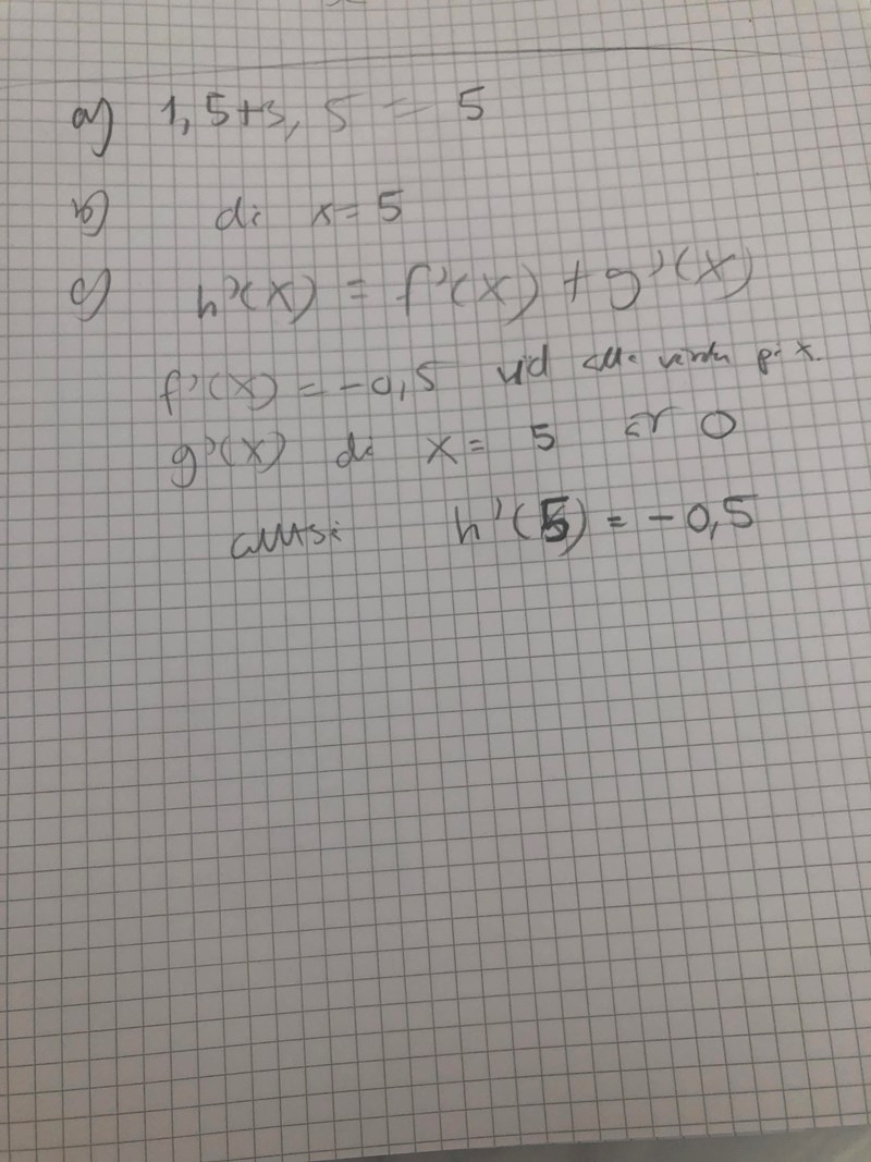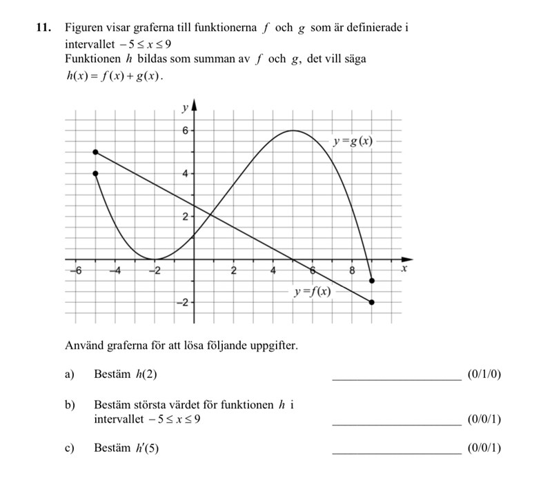 På b kan du tänka så här: f(x) minskar hela tiden. Det betyder att om du har ett intervall där g(x) också minskar kommer summan att minska. Det betyder till exempel att för alla x > 5 kommer summan att vara mindre än för x = 5. Så där behöver du inte ens räkna. Det knepiga är intervall där g(x) ökar. Jag skulle skissa summan i diagrammet för att se vad som händer där. Gör det för hela kurvan så ser du svaret.