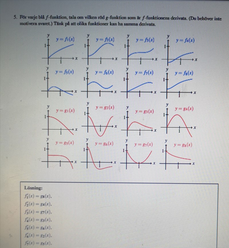 Om vi tex tittar på f1(x) så ser vi att vid x = 0 är lutningen (derivatan) ungefär 1 och avtar sedan långsamt, men är alltid större än noll. Det verkar som om g8(x) uppfyller detta, men inget annat alternativ verkar stämma.