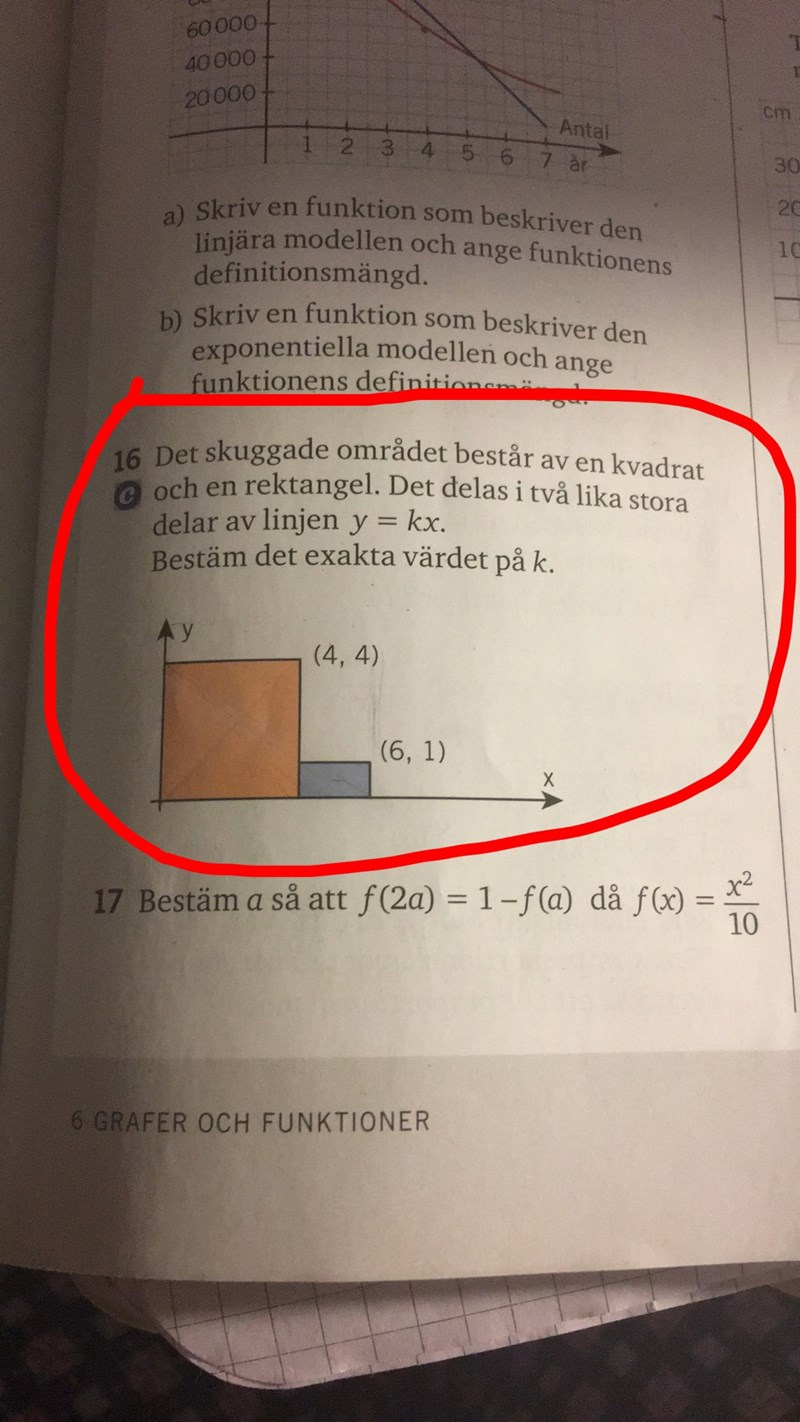 Jag förstår att arean blir 18 och att linjen delar den så att den blir 9. Men kommer inte längre än så, är ganska fast och bokens ledtråd förstår jag inte heller: